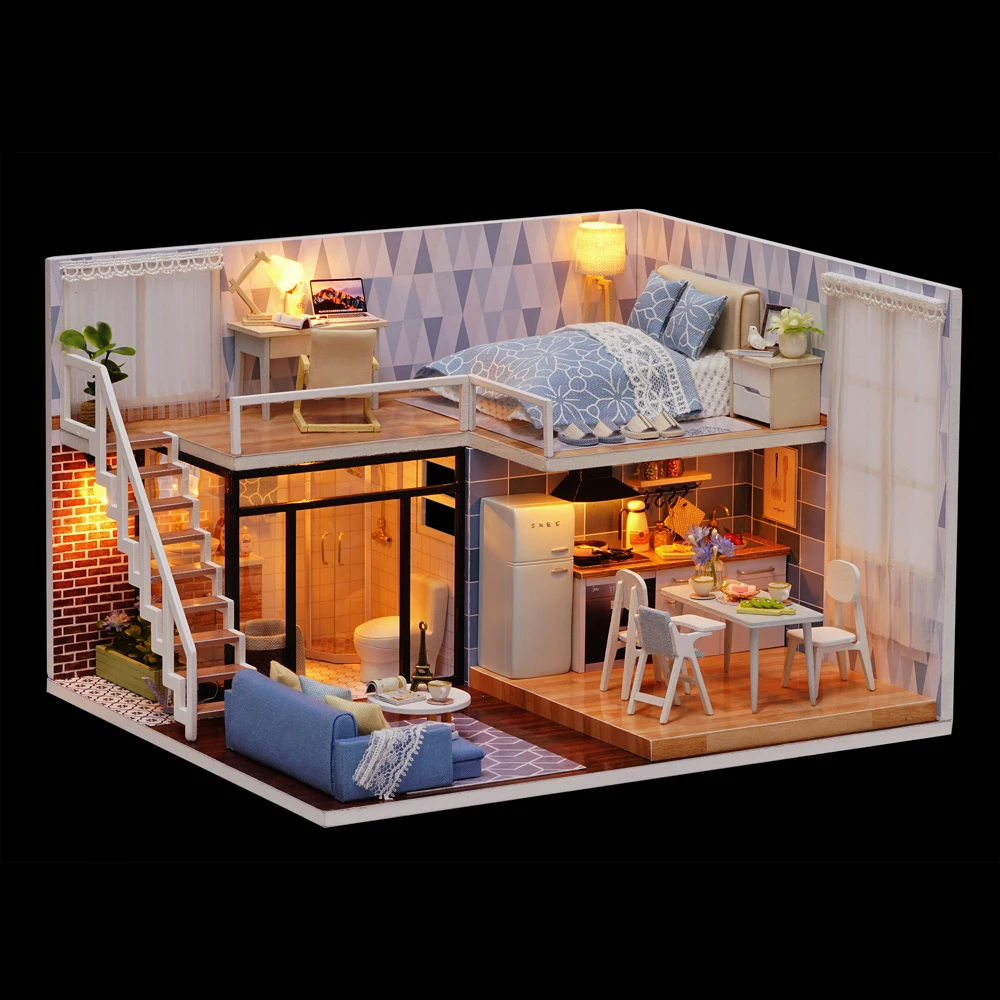 Diy Wooden Doll House Blue Apartment Miniature Dollhouse Toy House Model Building Girls Puzzle Toys Birthday Gift For 14 Doll House Accessories Aliexpress